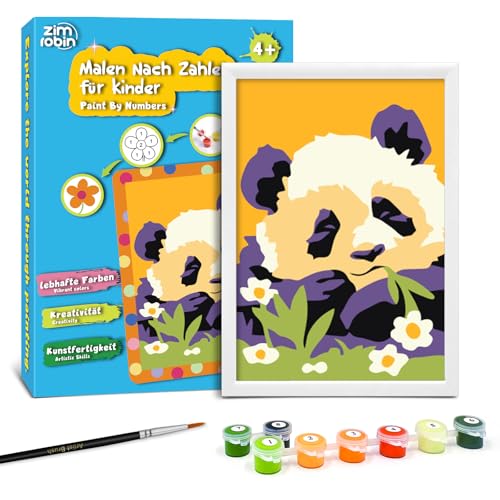 Zimrobin Malen Nach Zahlen ab 5 6 7 Jahre Mädchen und Junge, Malen Nach Zahlen für Kinder mit Rahmen 3 Pinsel und Acrylfarben, 18 X 24cm(Niedlicher Panda)