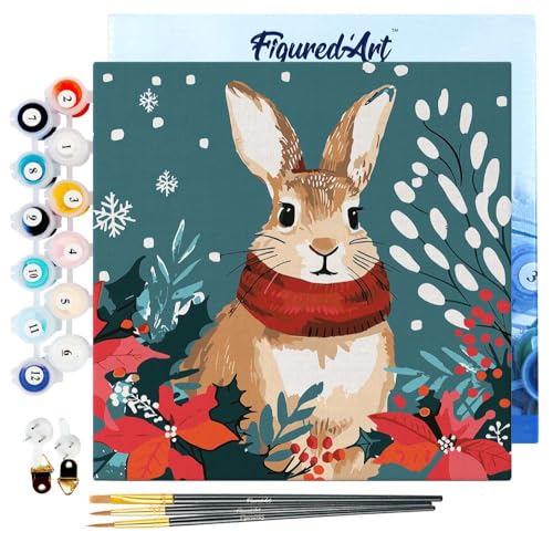 Figured'Art Mini Malen Nach Zahlen Erwachsene Mit Rahmen 20x20cm Kleines Format - Weihnachtshäschen - Paint by Numbers Basteln DIY Bastelset Leinwand gespannt auf Holzrahmen