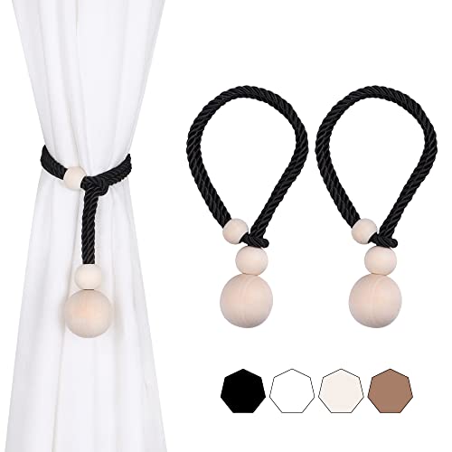 OCIOLI 2 Stück Schwarze Vorhang-Raffhalter Vorhangbinder Webart Seil Vorhang Holdback Drape Raffhalter mit Holzperlen Befestigen Ring Vorhanghalter Vorhangbinder für Vorhänge(schwarz, 2)