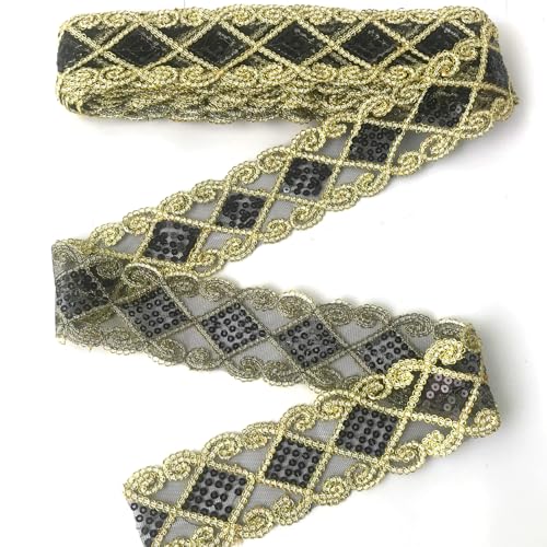Qililandiy 10 Yards Spitze Borten mit Pailletten Einfassborte Borte Band Applikation 9m x 5cm für Kleidung Gardine Vorhang Tischläufer DIY Deko Schwarz-Gold