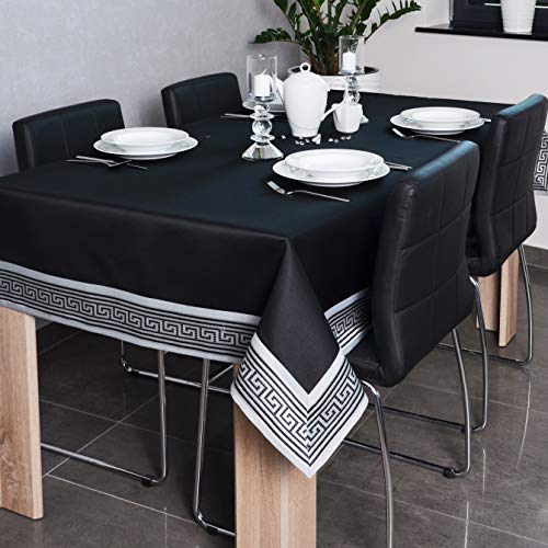 DECOOR - schmutzabweisende Tischdecke, veredelt mit einem 10 cm Breiten Dekorstreifen mit griechischem Muster, aus Satingewebe 200 g/m², 100% Polyester, hergestellt in EU (Schwarz, 140 x 300 cm)
