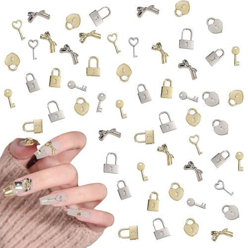 3D Nail Charms,60 Stück Sperren schlüssel Bogen Form Nagel Edelsteine, Gold Silber Metall Legierung nägel Art Charms Nagel Schmuck für Maniküre Design Dekorationen DIY -Kunsthandwerk