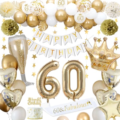 60 Geburtstagsdeko, gold 60 Geburtstag deko für Männer Frauen gold weiße Luftballons HAPPY BIRTHDAY Banner Nummer 60 Luftballons Krone Stern Herz Luftballons HAPPY 60th BIRTHDAY Kuchenaufsatz