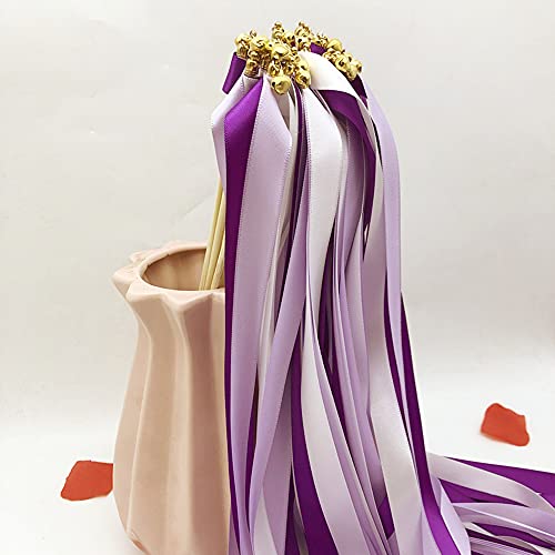 Zauberstäbe mit Band Glocken,50 Stück Luftschlangen Seide Fee Stick,Wedding Twirling Streamers Ribbon Wedding Wands Stick für Hochzeit Partys Babypartys Geburtstag Urlaub Feiern Weihnachten,Lila
