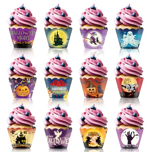 KOBOKO 12 Stück Halloween Cupcake Wrappers, Geist Muffin Deko, Topper Papier, Hexe Deko Torte, Muffinform Wrappers, Muffinförmchen Party Deko