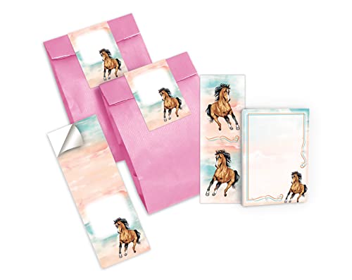 Junapack 12 Lesezeichen + 12 Mini-Notizblöcke + 12 Geschenktüten (Natur) + 12 Aufkleber Pferd Mitgebsel Gastgeschenk beim Kindergeburtstag Mädchen