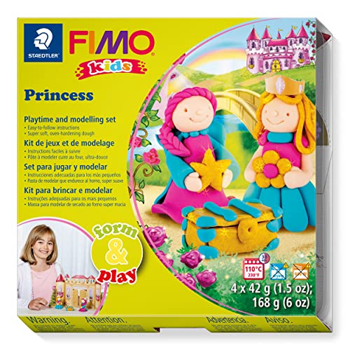 Staedtler 8034 06 LY Fimo kids form&play Set Princess (superweiche, ofenhärtende Knete, kinderleichte Anleitung, wiederverschließbare Box, Set mit 4 Fimo Blöcken, 1 Modellierstab und 1 Spielkulisse)