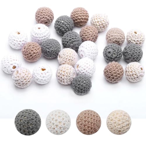 Gehäkelt Holzperlen,24 Stück Häkelperlen Gehäkelt Holzperlen mit Loch Runde Gehäkelte Perlen Auffädeln Handgefertigt Holzkugeln Häkelperle für DIY Schmuck Dekorationen Halskette Armband(grey-20mm)