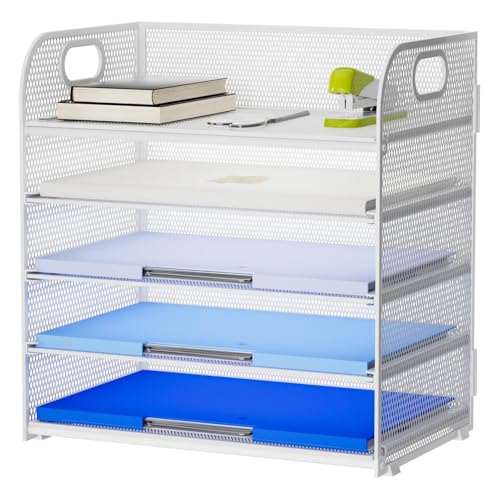 【Multifunktionaler Schreibtischorganizer】Der Schreibtischorganizer verfügt über ein 5-stufiges Design und eine große Kapazität. Unser 5-stufiger Briefablage mit 5 geräumigen Ablagen bietet ausreichend Stauraum und eignet sich perfekt für Briefe, A4-Papier, Bücher, Rechnungen, Zeitschriften, Post, Ordner, Notizbücher und vieles mehr. 【Einzigartiges Design】Briefablageorganizer zeichnet sich durch tragbare Griffe und ein Schiebeablagedesign aus. Die tragbaren Griffe ermöglichen eine einfache Mobilität, sodass Sie es überall dort platzieren können, wo es am bequemsten ist. Die Schiebeablage verbessert die Bedienbarkeit, ermöglicht es Ihnen, Dateien jederzeit leicht zu entfernen und zurückzustellen – erhöhen Sie Ihre Produktivität mit einem aufgeräumten Schreibtisch. 【Hohe Qualität】Dateiorganizer besteht aus hochwertigem Mesh-Material, hat eine Weiß pulverbeschichtete Oberfläche, ist mit 4 rutschfesten Füßen ausgestattet, verfügt über eine stabile Struktur und zuverlässige Leistung, und gewährleistet eine langanhaltende Festigkeit und zuverlässige Leistung für den täglichen Gebrauch. 【Einfache Installation】Verabschieden Sie sich von komplizierten Montageprozessen. Dieser Dateiorganizer wird mit einfachen Montageanleitungen geliefert – folgen Sie einfach den Anweisungen und montieren Sie ihn in wenigen Minuten. 【Breite Anwendung】Größe: 32 x 23 x 34 cm. Unser 5-stufiger Schreibtischorganizer eignet sich ideal für den Einsatz in Büros, Besprechungszimmern, Haushalten, Schulen und anderen Umgebungen.
