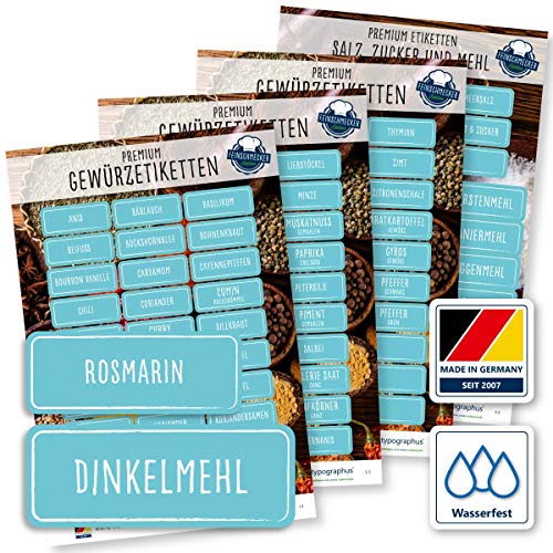 ✔️KOMPLETT - 82 selbstklebende Gewürzetiketten, 7 Aufkleber für Salz und Zucker, 10 Blanko Sticker in Größe 52 x 20 mm ➕ 13 Aufkleber für Mehl, 5 Blanko Sticker in Größe 65 x 25 mm ✔️ HOHE QUALITÄT - Robust und haltbar und trotzdem abwaschbar durch unsere Premium PVC Folie. ✔️ PERFEKTE LESBARKEIT – Detaillierte Schrift, lange Haltbarkeit. Leichtes Verkleben auf Gewürzdosen und Gewürz Gläsern ✔️ PRAKTISCH - Jedes Etikett ist abwischbar und wasserfest. Die Aufkleber sind geeignet für Gewürzgläser, Regal, Gläser und Gewürzdosen ✔️ MADE IN GERMANY - Hergestellt in Deutschland
