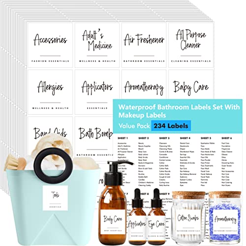 Hebayy 234 Entfernbare Kursive Badezimmer Etiketten, Enthält 18 Leere Aufkleber, Wasser-/Öl-/Reißfest, Keine Rückstände von Abziehbildern, Vorgedruckte Aufkleber für Bad, Schönheit und Make-up