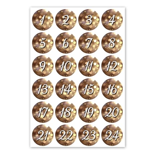 24 Adventskalender-Zahlen-Aufkleber, braun gold I rund Ø 4 cm I DIY Sticker Set I Weihnachtsaufkleber Geschenk-Aufkleber dv050