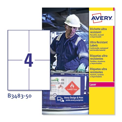 Avery B3483–50 A4 Ultra robuste Wasserdicht GHS Etiketten, bs5609 zertifiziert, für alle Drucker, 105 x 148 mm, weiß