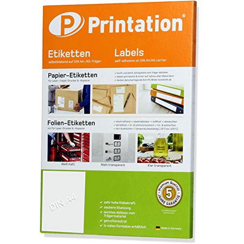 Sticker Papier zum Bedrucken : Unsere Etiketten selbstklebend A4 bieten höchste Qualität für Ihre Druckbedürfnisse. Mit 210x297 mm DIN A4 Format ist das Klebepapier A4 bedruckbar ideal für vielseitige Anwendungen geeignet. Klebeetiketten zum bedrucken perfekt für Sticker selbst gestalten. Klebeetiketten zum Bedrucken : Diese universellen Adressaufkleber selbstklebend sind perfekt für den Einsatz mit Inkjet- und Laserdruckern. Das Etikettenpapier A4 für Drucker ist weiß und matt, was eine professionelle Präsentation garantiert. Format kompatibel zu Avery Zweckform 3478 3352 6119, Herma 4461 4428 5065 8637, Sigel LA181 LA182, Decadry DLW-1793 OLW-4793, Radex E210297, Staples 9106279, Pripa und Otto-Office INT-33559. Etiketten Selbstklebend Bedruckbar : Unsere Versandetiketten selbstklebend bieten zuverlässige Haftkraft. Dieses Druckerpapier selbstklebend ermöglicht klare und präzise Druckergebnisse, perfekt für Versand und Organisation. Printation Etikettenpapier A4 bedruckbar - Qualität MADE in GERMANY. Stickerpapier zum Selbst Drucken A4 : Mit diesen selbstklebende Etiketten gestalten Sie leicht personalisierte Etiketten A4. Das Aufkleber Papier für Drucker A4 ist flexibel und kann für verschiedene Anwendungen verwendet werden. Stickerpapier zum selbst drucken A4 für indivduelle Klebeetiketten zum beschriften. Selbstklebendes Papier A4 / Selbstklebendes Papier für Drucker zum Sticker selber gestalten. Etiketten Papier A4 für Drucker : Die Universaletiketten DIN A4 sind vielseitig einsetzbar, ob als Klebeetiketten A4 oder als sonstige Etiketten & Aufkleber. Das Etiketten selbstklebend A4 Format bietet Ihnen eine praktische Lösung für jede Herausforderung.