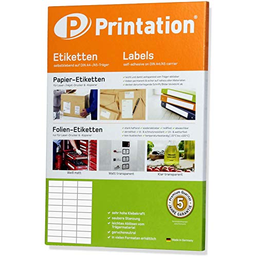 Adressetiketten selbstklebend : Unsere 70x29,7 mm Etiketten sind ideal für Adressetiketten selbstklebend. Mit 30 Aufklebern pro Blatt bieten sie ausreichend Platz für alle wichtigen Informationen und garantieren einen sicheren Halt auf jeder Oberfläche. Printation Etiketten selbstklebend bedruckbar - Made in Germany. Sticker Papier zum Bedrucken : Das Sticker Papier zum Bedrucken ist universell einsetzbar und eignet sich perfekt für Inkjet- und Laserdrucker. Die Etiketten sind matt und blanko, was Ihnen volle kreative Freiheit für Ihre Druckprojekte gibt. Format kompatibel zu Herma 4456 4612, Avery Zweckform 3489, Sigel LA122 und JAC 7029. Universal Aufkleber : Mit unseren Universal Aufklebern können Sie nahezu jedes Projekt realisieren. Die selbstklebenden Etiketten sind ideal für Kennzeichnungen und können mühelos auf Laser-, Inkjet-Druckern und Kopierern verwendet werden. Etikettenpapier A4 bedruckbar mit 30 Klebeetiketten zum beschriften bzw. bedrucken pro Blatt. Klebeetiketten zum Bedrucken : Unsere Klebeetiketten zum Bedrucken bieten 300 Etiketten verteilt auf 10 A4-Blätter. Sie sind perfekt für den täglichen Gebrauch im Büro oder Zuhause, um Ihre Dokumente und Utensilien übersichtlich zu gestalten. Universell verwendbar auch als Adressaufkleber - Aufkleber zum Beschriften oder Bedrucken. Gewürzetiketten Selbstklebend : Verleihen Sie Ihrer Küche ein ordentliches Aussehen mit unseren Gewürzetiketten selbstklebend. Sie sind speziell für die Kennzeichnung von Gewürzgläsern entwickelt und haften sicher auf allen gängigen Oberflächen. Klebepapier A4 bedruckbar mit 3x10 Etiketten selbstklebend 70x30 pro DIN A4 Bogen.