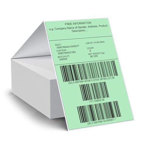 Spezifikationen:Sie erhalten 100 x 150 mm Thermoetiketten, insgesamt 257 Stück, ausreichend für Ihren täglichen Druckbedarf. Unsere Fanfold-Etiketten passen auf die meisten einstellbaren Thermodrucker, ohne dass Tinte, Toner oder Farbband benötigt werden. Hochwertige Materialien: Thermische Etiketten besteht aus Vinyl, das es Ihnen ermöglicht, mit tiefen und klaren Farben zu drucken und direkt mit einem Marker zu schreiben. Diese Thermoetiketten sind wasserdicht, ölbeständig und reißfest, was die Beschädigung und den Abrieb der Etiketten während des Transports wirksam reduziert. Einfach Verwendung: Die Etiketten sind mit perforierten Linien versehen, die eine einfache Trennung ermöglichen.Gleichzeitig lässt sich das Etikett sehr leicht abziehen und hinterlässt keine Rückstände, wenn es an der Zeit ist, das Etikett zu übertragen. Druckt Wunderschön: Unsere Fanfold Etiketten verkürzen die Zeit, die zum Einlegen neuer Etiketten in den Drucker benötigt wird, und gewährleisten, dass das bedruckte Aufkleber flach und frei von gewölbten Oberflächen ist. Vielseitig Verwendung: Diese bedruckbaren Thermoaufkleber können in Büros, Lagern, in der Logistik und an anderen Orten verwendet werden. Sie sind ideal für Versandadressen, Markenzeichen, Produktbeschreibungen, Barcodes, DIY-Designs, Inventar und Sortimentsetiketten.