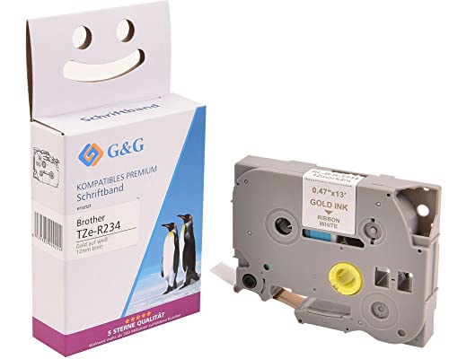 🔹 G&G Schriftband TZe-R234 - 12 mm breit x 4m lang 🔹 Goldene Schrift auf weißem Band 🔹 Eigenschaften: Nicht klebend ,Glatt und glänzend, Der Druckeffekt ist Klar ,Abriebfest ,Lichtecht 🔹 Breite Anwendbarkeit: Geschenken und Blume, handgefertigte Produkte, Fotoalbum-Dekoration 🔹 Dank der Thermodrucktechnologie sind weder Tinte noch Toner erforderlich, Die Kassetten können schnell und bequem ausgetauscht werden, während Sie an einem Projekt arbeiten