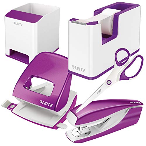 Leitz Set weiß/violett + Leitz Locher und Leitz Heftgerät in Metallausführung + Leitz Qualitätsschere WOW, mit ergonomischen Soft-Touch Griffen, mit Schraube zum Nachjustieren, extrem scharf für hohe Schnittpräzision, 205 mm + Leitz Klebeband-Abroller WOW Duo Colour, Stabiler und schwerer Tischabroller für rutschfesten Stand und bequeme Bedienung mit nur einer Hand + Leitz Sound Stifteköcher WOW, Duo Colour, mit einem separaten Fach für das Smartphone (bis iPhone 6 Plus), Smartphone Bildschirm bleibt vollständig sichtbar. Die Soundverstärkungsfunktion, erhöht das Klangvolumen des Mobiltelefons.
