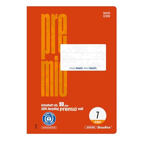 Staufen premio Schulheft - 10 Hefte je 16 Blatt, DIN A5, Lineatur 7 (7mm kariert), 90 g/m² Recyclingpapier, runde Ecken verhindern „Eselsohren“