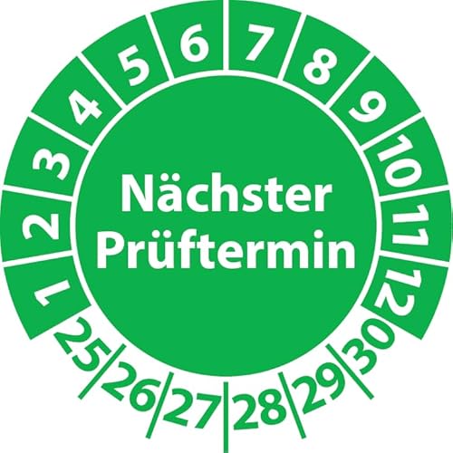 Prüfplakette Nächster Prüftermin, Vinylfolie, selbstklebend, Prüfaufkleber, Prüfetikett, Plakette (25 mm Ø, Grün, 500)