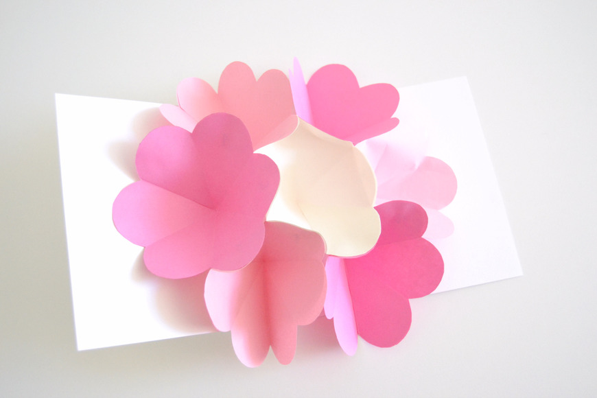 Lege die Blüten so in die Karte, dass das offene Ende genau so nah an der Falz der Karte liegt, dass die Karte noch zu geht. Klebe jeweils nur das mittlere Blütenblatt an der Karte fest.