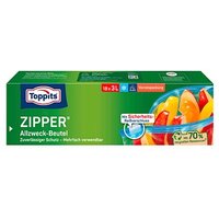 Toppits ZIPPER Gefrierbeutel 3,0 l – praktische Aufbewahrung für frische LebensmittelDie Toppits ZIPPER Gefrierbeutel sind die ideale Lösung für die sichere und hygienische Aufbewahrung von Lebensmitteln. Mit 18 Beuteln pro Packung sind Sie bestens ausgestattet, um frische Zutaten optimal zu lagern oder einzufrieren.Die wichtigsten Vorteile auf einen Blick:Farbe: Transparent – ideal, um den Inhalt sofort zu erkennenFassungsvermögen: Jeder Beutel fasst bis zu 3,0 Liter, perfekt für mittelgroße Portionen oder SnacksVerschlussart: Praktischer Reißverschluss – damit lassen sich die Gefrierbeutel schnell und einfach öffnen und wieder verschließenVielseitige Anwendung: Die Toppits Zipper Gefrierbeutel eignen sich zum Einfrieren mittlerer Portionen Gemüse oder das Aufbewahren von Nüssen und kleinen Snacks70% recyceltes MaterialDie Toppits Zipper Gefrierbeutel überzeugen durch höchste Qualität. Sie sind zu 70% aus Recyclingmaterial hergestellt und sehr robust und mehrfach verwendbar.Egal, ob im Alltag oder beim Meal Prep, die Toppits Zipper Frischhaltebeutel sind ein unverzichtbares Hilfsmittel in jeder Küche.Bestellen Sie jetzt und profitieren Sie von der praktischen Verpackung mit 18 Stück!