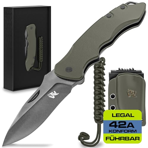 SENSATIONELLER STAHL - Das Zweihand Messer ist aus erstklassigem D2 Stahl. Ein wahres Arbeitstier für jede Gelegenheit. Draußen beim Wandern oder auf der Reise verrichtet unser Taschenmesser stets grandiose Arbeit. UNIVERSAL EINSETZBAR - Egal, ob Du das Klappmesser Zweihandmesser als Angelmesser, Survivalmesser, Wandermesser oder Camping Messer nutzen möchtest - Dein Profesionelles Folding Knife ist stets einsatzbereit. STYLISCHE GESCHENKBOX - Du suchst etwas Extravagantes und Edles? Etwas, das sich auch hervorragend als Geschenk eignet? Mit dem Wolfgangs Survival Outdoor-Messer bereitest Du ganz einfach eine große Freude! PRAKTISCH UND GRIFFBEREIT - Starkes Set zusammen mit einem stylischem Leder-Holster. Ob am Gürtel oder Rucksack befestigt, ist es als Campingmesser in der Wildnis, Angeln oder Schnitzen stets schnell griffbereit. LEGAL IN DEUTSCHLAND - Unser leicht handhabbares und besonders hochwertig verarbeitetes Klapp-Messer, ist ein speziell konzipiertes Zweihand-Messer, das in Deutschland öffentlich mitgeführt werden darf.