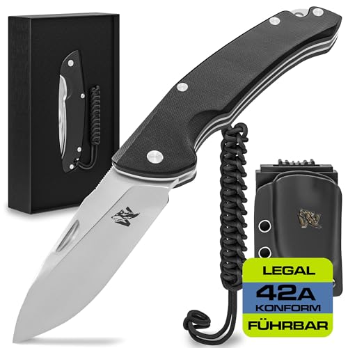 UNIVERSAL EINSETZBAR - Egal, ob Du das Telum Klappmesser als Rettungsmesser, Angelmesser, Survivalmesser, Wandermesser oder Camping Messer nutzen möchtest - Dein Profi Folding Knife ist stets einsatzbereit. STYLISCHE GESCHENKBOX - Du suchst etwas Hochwertiges und Stabiles? Etwas, das sich auch hervorragend als Geschenk eignet? Mit dem Wolfgangs Survival Outdoor-Messer bereitest Du ganz einfach eine große Freude! PRAKTISCH UND GRIFFBEREIT - Starkes Set zusammen mit einem praktischen Kydex Holster. Ob am Gürtel oder Rucksack befestigt, ist es als Campingmesser in der Wildnis, Angeln und Schnitzen stets schnell griffbereit. HOCHWERTUG UND STABIL - Das Zweihand Messer aus Highend D2 Stahl lässt Dich dabei nicht im Stich. Draußen beim Wandern oder auf der Reise im Auto verrichtet unser Taschenmesser stets ausgezeichnete Arbeit. LEGAL IN DEUTSCHLAND - Unser leicht handhabbares und besonders hochwertig verarbeitetes Klapp-Messer, ist ein speziell konzipiertes Zweihand-Messer, das in Deutschland öffentlich mitgeführt werden darf.